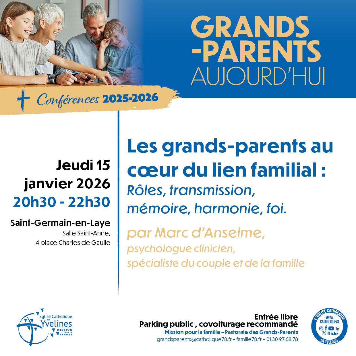 Une conférence – partage sur le thème : « Les grands-parents au cœur du lien familial : rôle, transmission, mémoire, harmonie, foi » par Marc d’Anselme, psychologue clinicien, spécialiste du couple et de la famille,