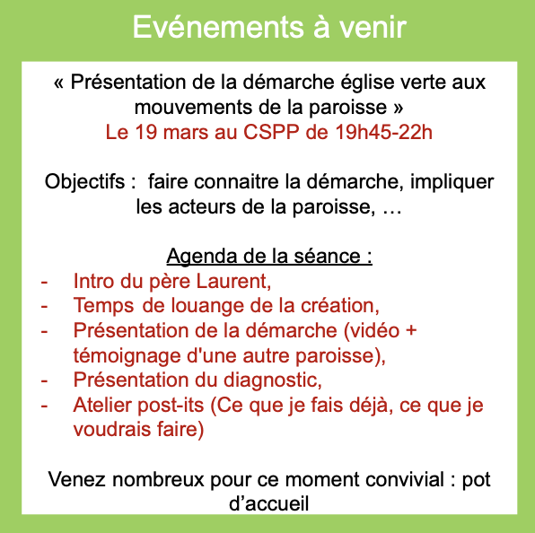 Les Eglises vertes autour de nous : les 3 paroisses du doyenné (Sartrouville, Houilles, Maisons-Laffitte & Le Mesnil-Le-Roi) sont engagées dans cette démarche. Au niveau du diocèse de Versailles : ???? En France : ????., Au niveau mondial : ?????
