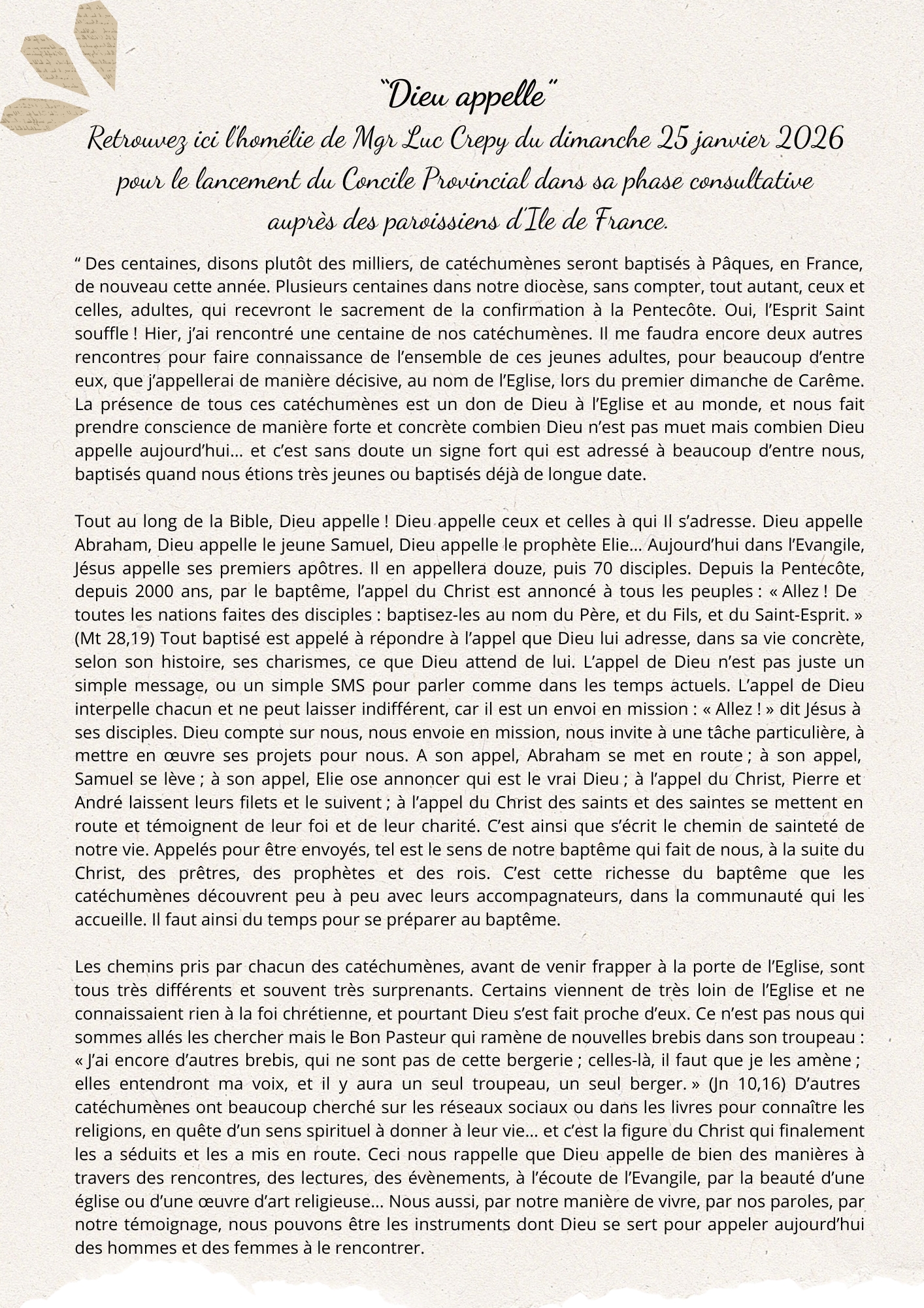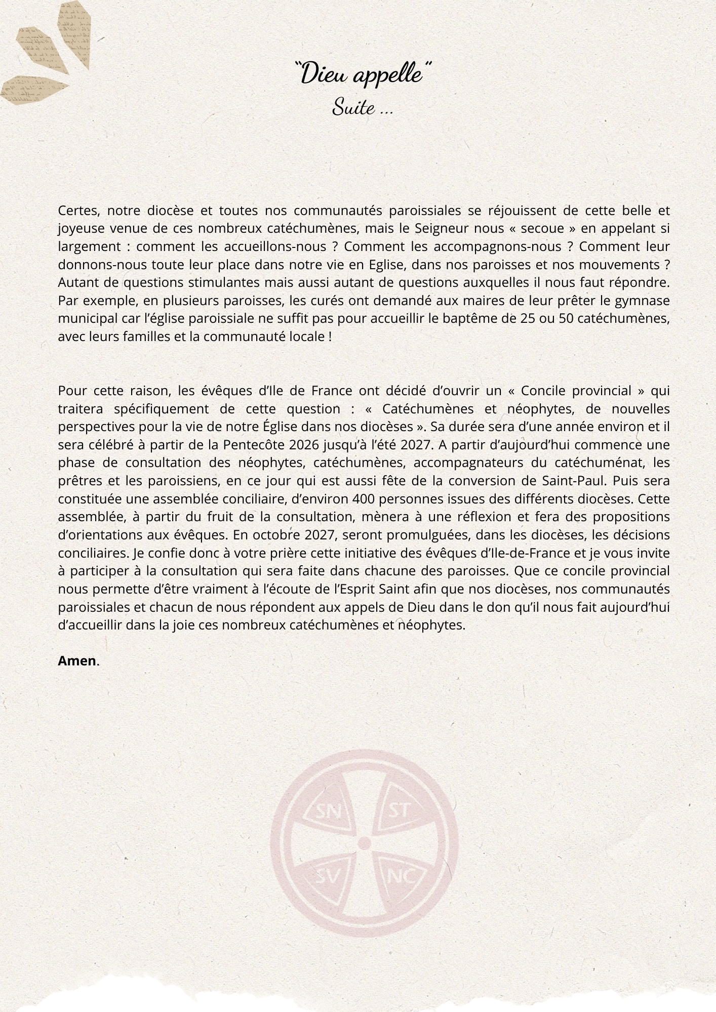 La phase de consultation des catéchumènes, néophytes, accompagnateurs et des paroissiens s’achèvera le 1er juillet 2026.