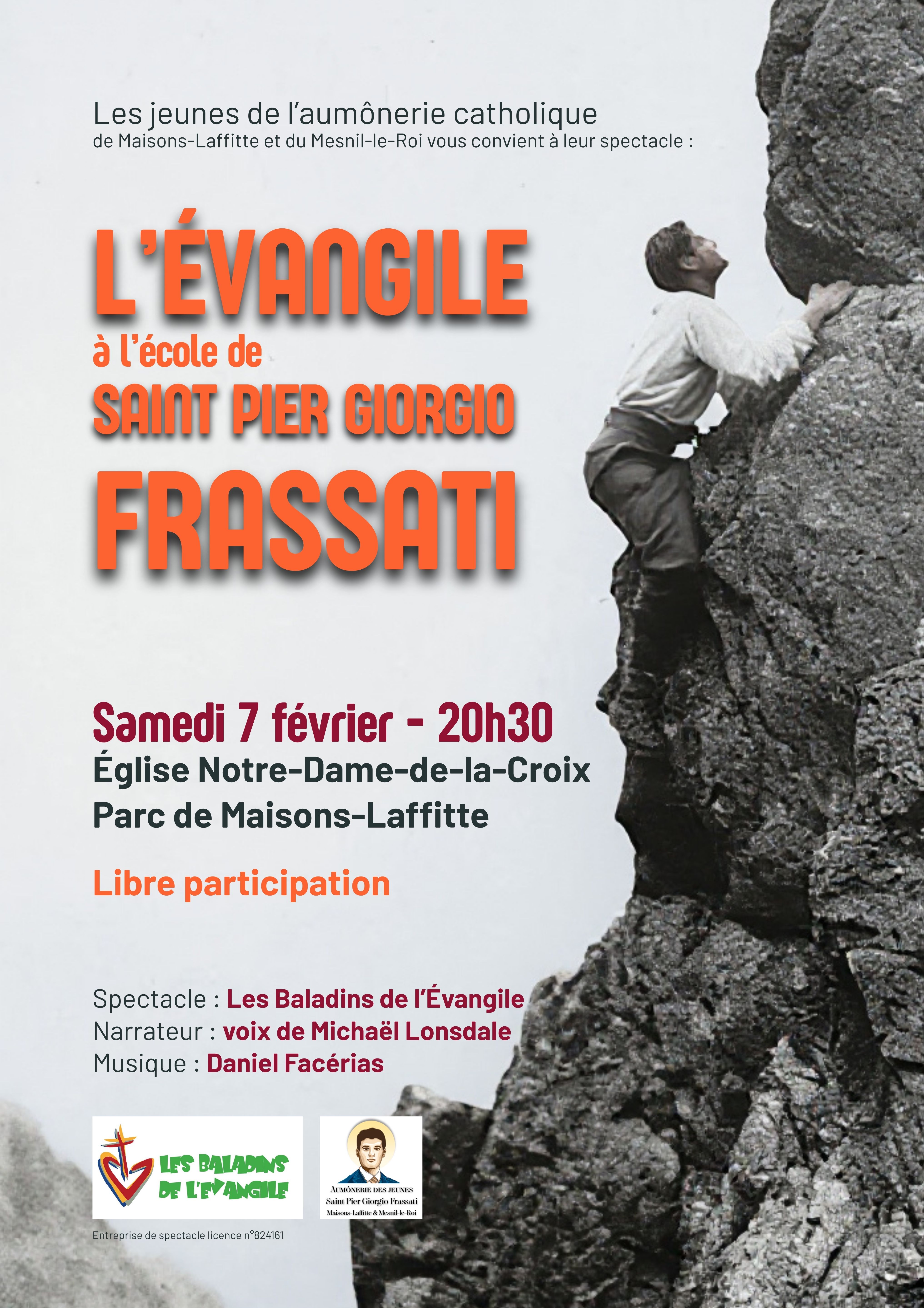 Les jeunes de l’aumônerie de Maisons-Laffitte et du Mesnil-le-Roi vous invitent à découvrir « L’Évangile selon Saint Pier Giorgio Frassati », un spectacle original en collaboration avec les Baladins de l’Evangile qui sera présenté le samedi 7 février 2026 à 20h30, à l’église Notre-Dame-de-la-Croix.